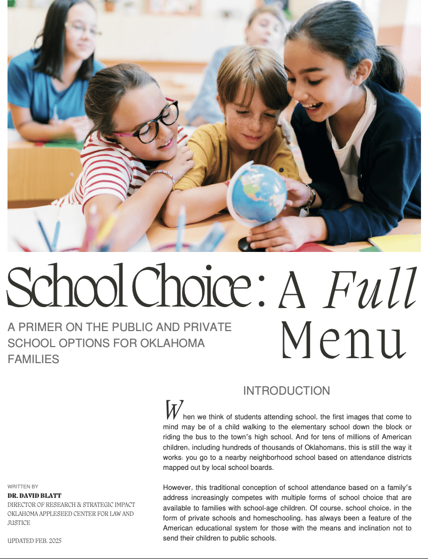 The first part of this publication will explore five public school alternatives to neighborhood schools: school transfers; magnet schools; charter schools; virtual schools, and alternative schools. The second part will look at three ways in which Oklahoma allows public dollars to be used to support private schools: Lindsey Nicole Henry Scholarships; Equal Opportunity Scholarships; and Parental Choice Tax Credits. It also includes a new section exploring current federal support for school choice. The third part will look briefly at homeschooling.